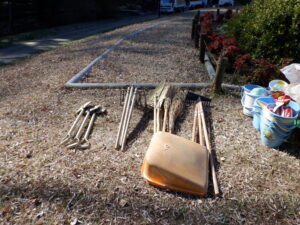 ベニバナの支柱立て、クチナシの選定、アイ・ミカン・クチナシに薬剤散布を